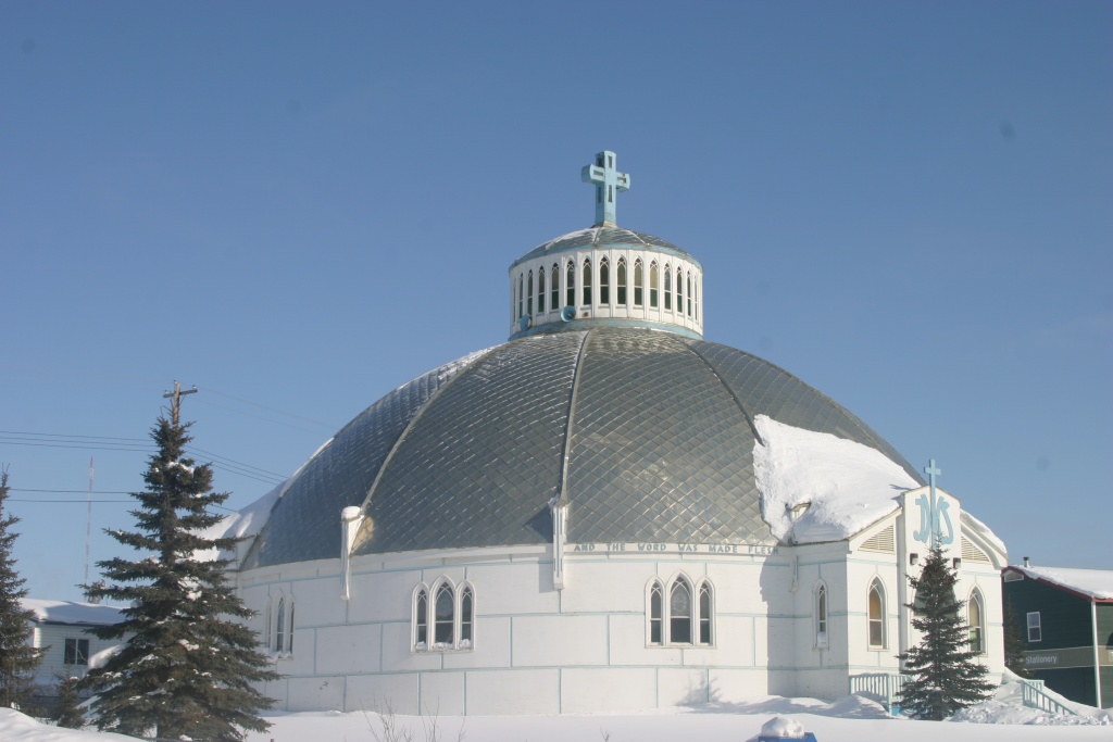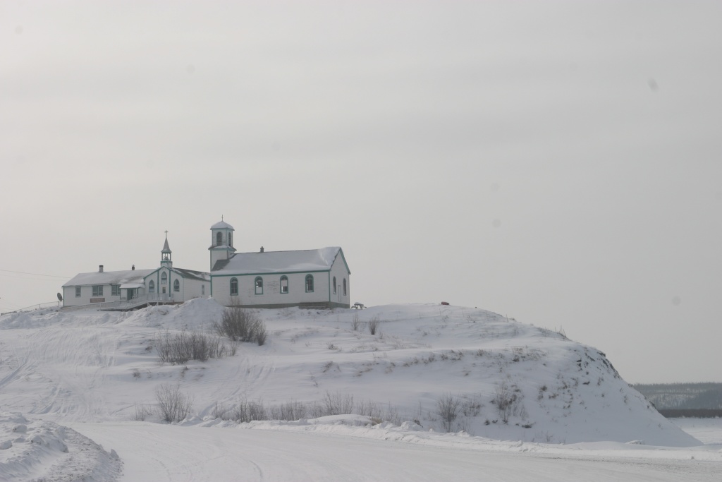 Tsiigehtchic (Arctic Red River) church keeping an eye on the couple ‘parking’ in the middle of the Mackenzie River