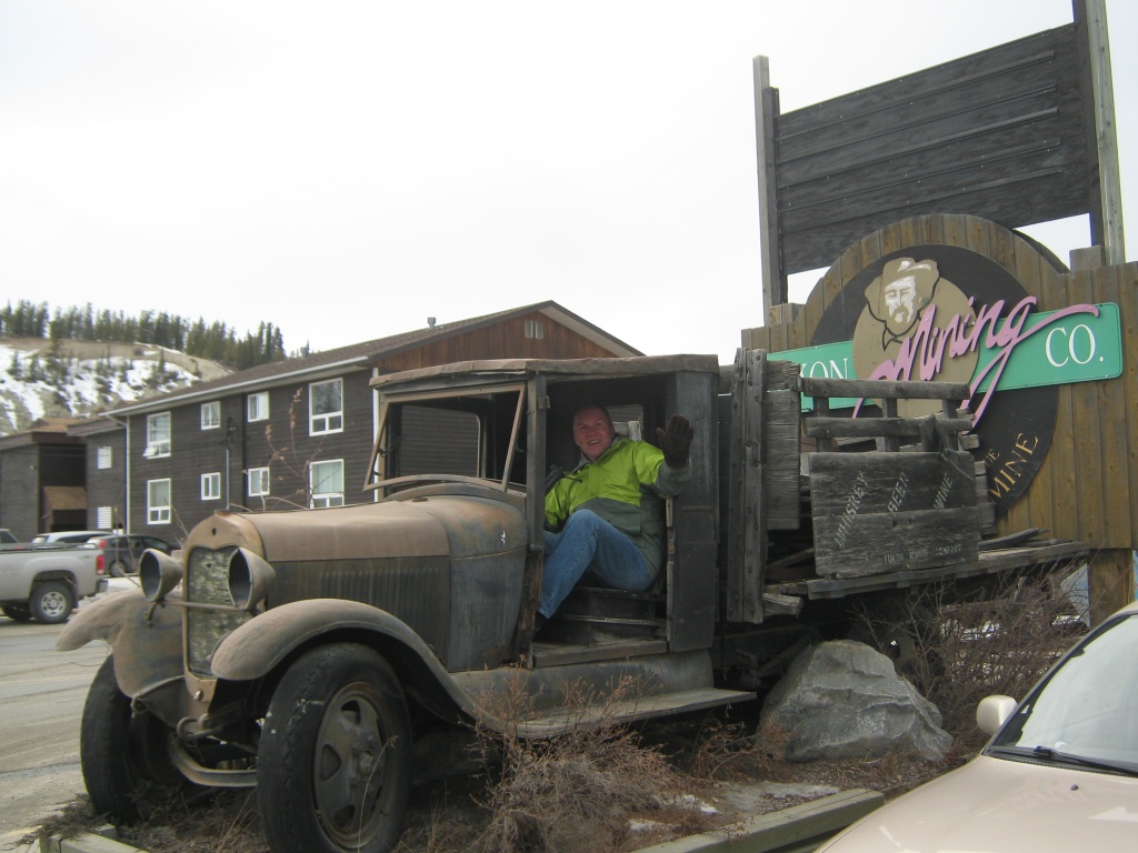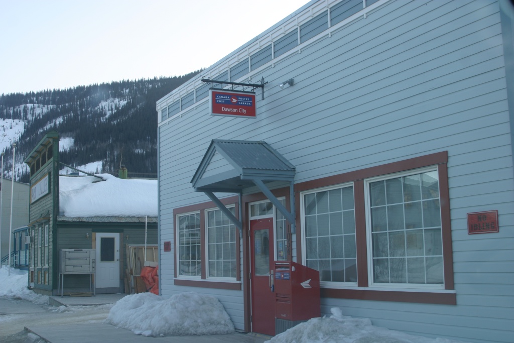 We woke up in the Aurora Inn in Dawson City to temperatures of -26C. After some coffee, yogurt and berries we headed out. Julie notes “Not that I’m complaining BUT someone ate the last of the yogurt. I’ll let you guess who.” I tried airing up the dually but at those temperatures I was freezing my fingers before getting much air in the inside dually. Julie notes “He kept mumbling through frozen lips something about needing an extender on his valve. My brother suggested via email it could be a shrinkage issue due to cold. It all sounded too personal so I ignored him, even when he was wrangling the retractable air hose, fiddling with freezing extenders and very noisily (and rather annoyingly I might add) pounding on the side of the truck for me to turn off the engine Why do I always have to do everything? And did I mention I didn’t even get any yogurt for breakfast!” We headed out for Whitehorse the way we were air/tire wise. But first we stopped by the post office so Julie could mail a couple of items.
