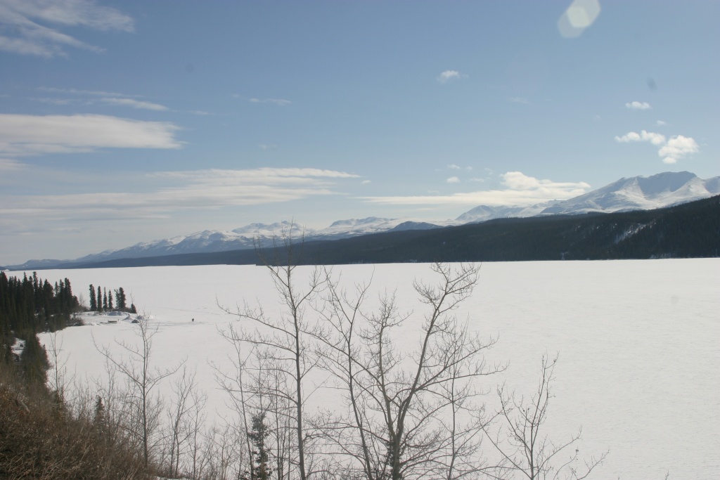 Todays drive was about 550 kilometres. We drove by the very picturesque Fox Lake not far from Whitehorse. Julie notes “Prior to this we drove along at least 25 kms of the remains of the 1987 Fox Lake forest fire. I’m sure there was new growth hiding under the snow but a reminder of nature’s force. Also yesterday we forgot to mention the crazy ptarmigans that seemed to be racing along side and in front of our truck. Or they were playing chicken, which is maybe how they got their nickname Arctic chicken. Snow buntings and grouse were plentiful too. A bald eagle rose up beside us and I got to watch it through the sunroof, zoom over the truck at very close range. Not to be confused with the slightly balding eagle scout at very close range beside me IN the truck.”