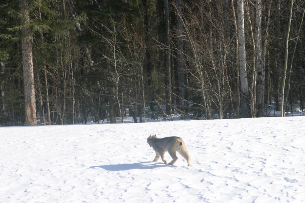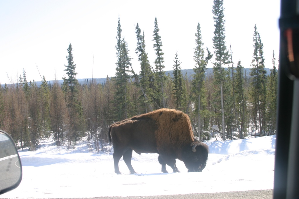 The highlight of the day, and a much rarer sighting than the bison was to follow. We spotted a Canada Lynx sitting in the snow on the side of the highway. He stayed put even when we coasted right up beside him. We have never seen one in the wild before, so this was a real treat. The paws are huge and he was able to stay on top of the snow. An amazing sighting for us!