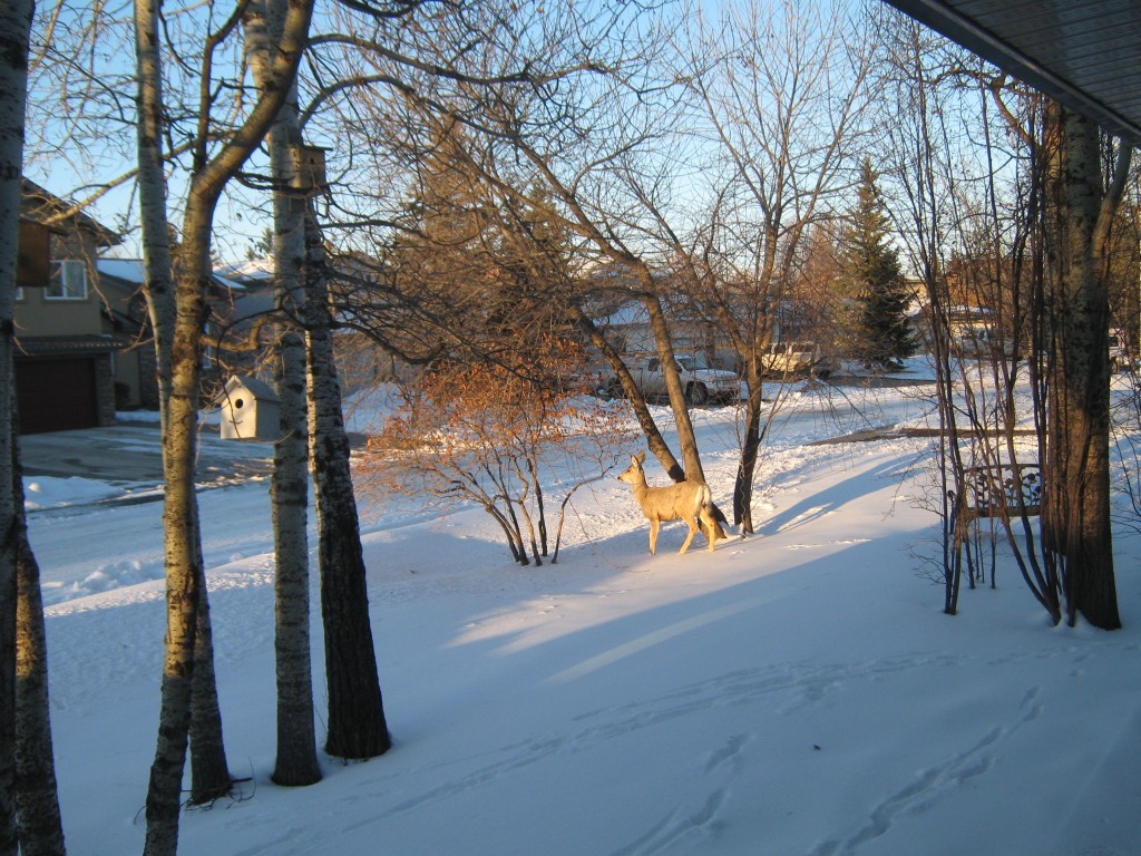 When we got home, one of the first things we witnessed were 2 small mule deer in our front yard nibbling on the Saskatoon bushes.
