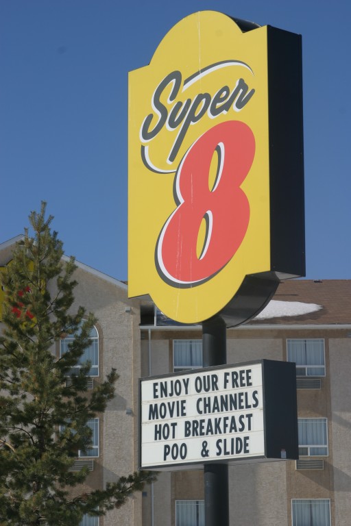 Just before Fort Nelson, BC we spotted two caribou. We stopped for brunch in Fort Nelson at the hotel we had stayed in on the way north. However, it was closed so we found Grandma Lee’s bakery. While we were looking for a place to eat we drove by the Super 8. Check out the photo! You can’t make this stuff up!